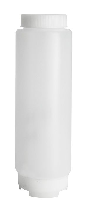 Serve condiments, sauces, and toppings with ease by using this 16 oz. multi-purpose FIFO squeeze bottle. Its unique design uses gravity to dispense downward, with a wide mouth opening at each end to allow for sanitary dispensing and quick, easy refills. With an easy-to-use squeeze design, this squeeze bottle is great for customers and staff to serve condiments, sauces, or toppings.