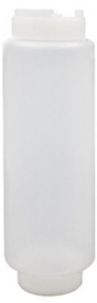 Serve condiments, sauces, and toppings with ease by using this 20 oz. multi-purpose FIFO squeeze bottle. Its unique design uses gravity to dispense downward, with a wide mouth opening at each end to allow for sanitary dispensing and quick, easy refills. With an easy-to-use squeeze design, this squeeze bottle is great for customers and staff to serve condiments, sauces, or toppings.